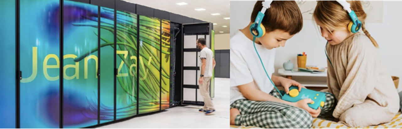 À gauche : le supercalculateur Jean Zay (Crédits : Cyril FRESILLON / IDRIS / CNRS Photothèque) - À droite : deux enfants jouant avec la "Fabrique à histoires Lunii (Crédits : Lunii)