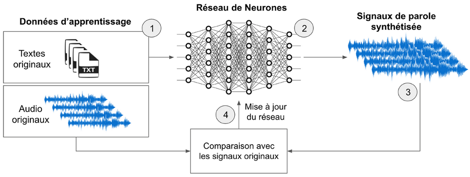 On va alors demander au réseau de neurones de lire un texte. Il va produire de l’audio avant de le comparer avec la version enregistrée par un acteur ou une actrice. Le réseau de neurones va alors se mettre à jour, pour une réduction progressive des erreurs et un rapprochement optimal avec la version cible enregistrée par une actrice ou un acteur.