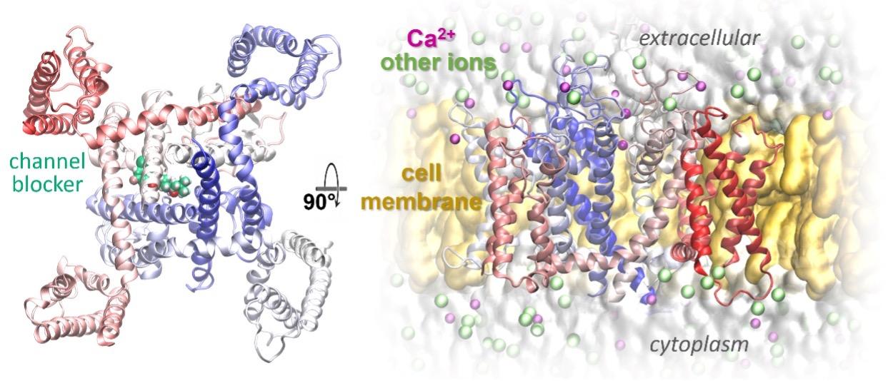 Figure de Droite : Simulations de dynamique moléculaire tout-atome de Cav3.1 (sans bloqueur) dans un environnement transmembranaire avec des lipides et un solvant explicites.