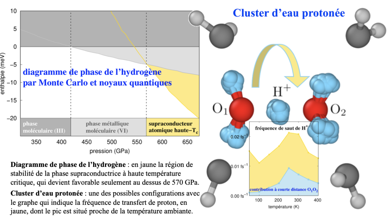 L’enjeu est alors de développer une approche numérique prédictive qui puisse prendre en compte les effets quantiques nucléaires aussi bien que ceux liés aux corrélations électroniques. Nous pourrions ainsi décrire des phénomènes tels que la supraconductivité, qui affiche les températures critiques les plus élevées pour certains hydrures, et le transfert de proton, qui joue un rôle fondamental dans la détermination des propriétés thermodynamiques de l’eau.